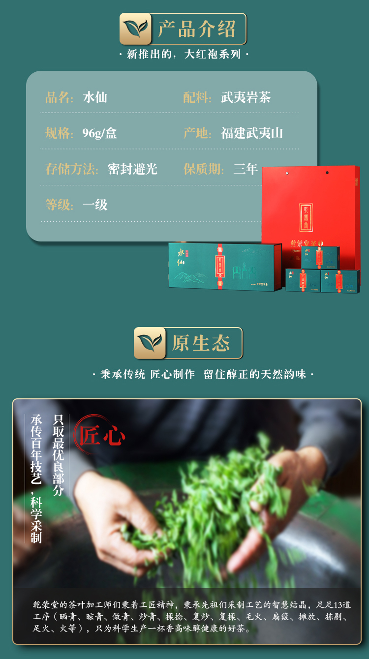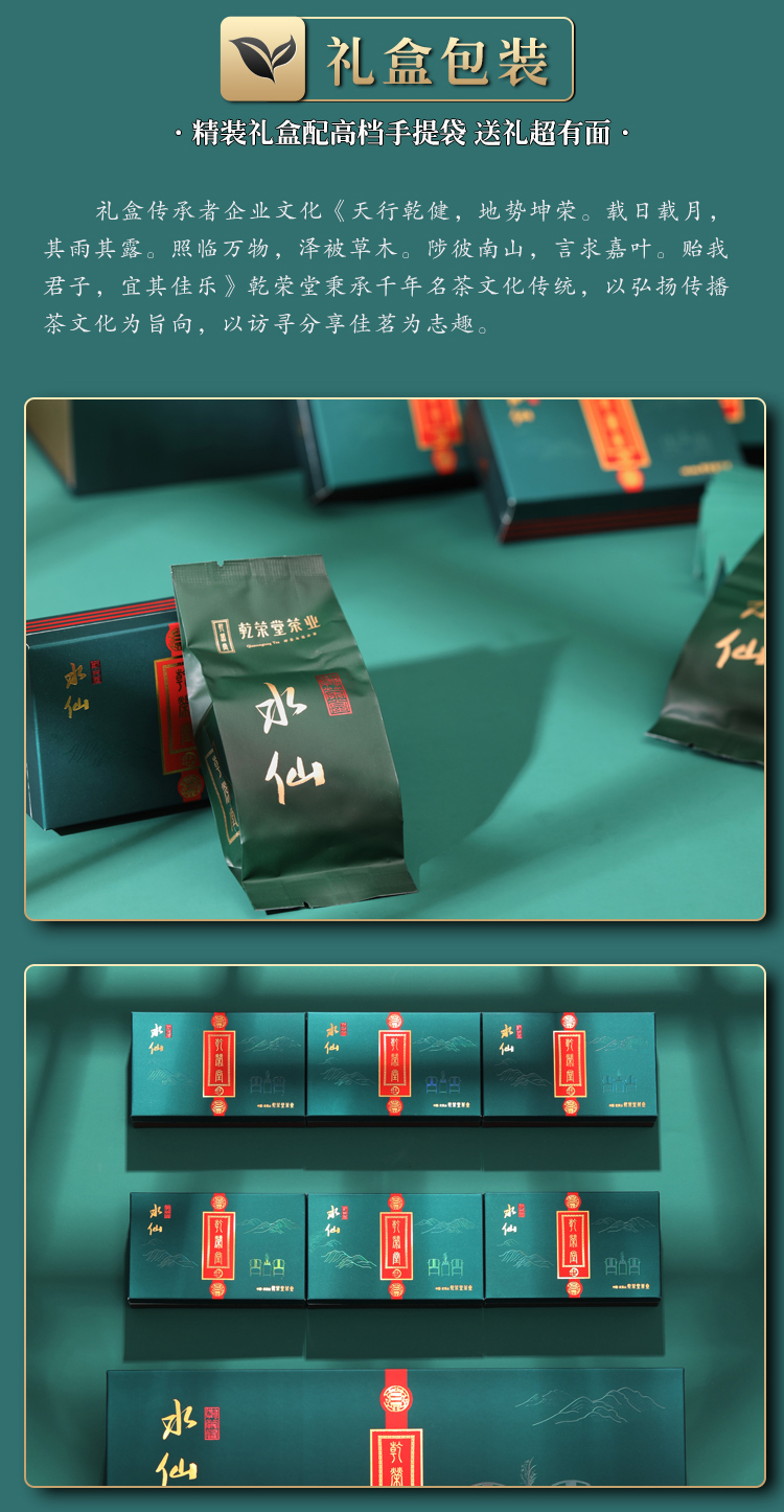产品简介:武夷岩茶中素有醇不过水仙,香不过肉桂之说,幽兰之香心旷神怡让人忘返。乾荣堂茶师们的精湛工艺,层层把关,为您精挑细选的兰香水仙其外形条索紧结壮实稍扭曲色灰褐油润、汤色橙红明亮、香似兰清幽细长、滋味醇和爽口,叶底软亮红边显。