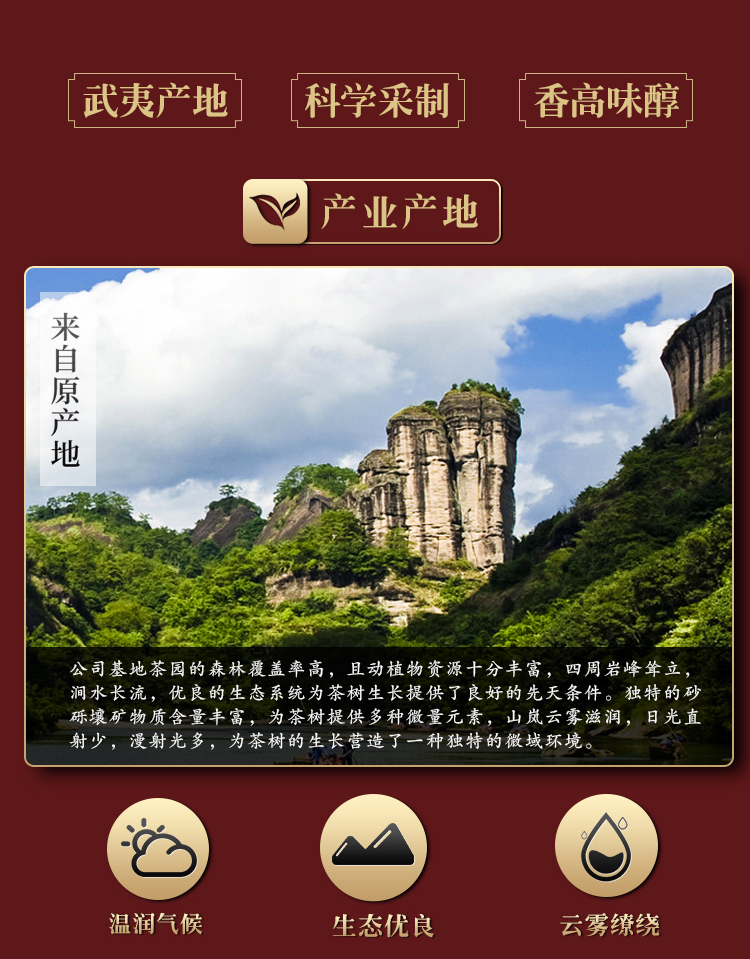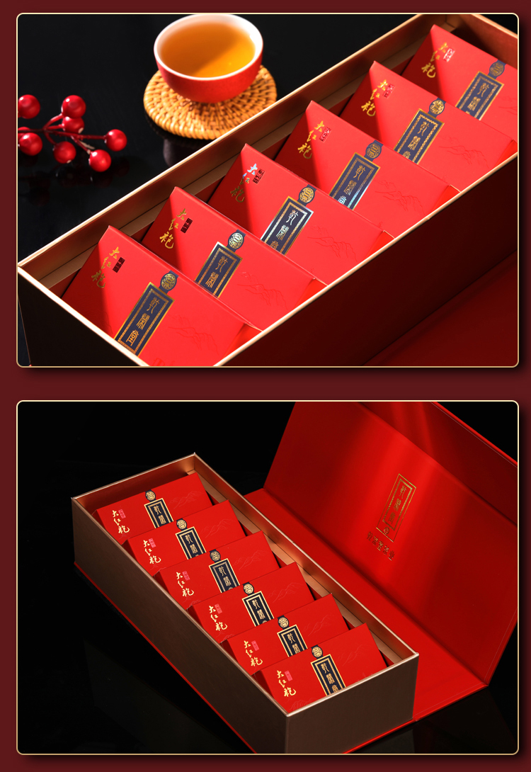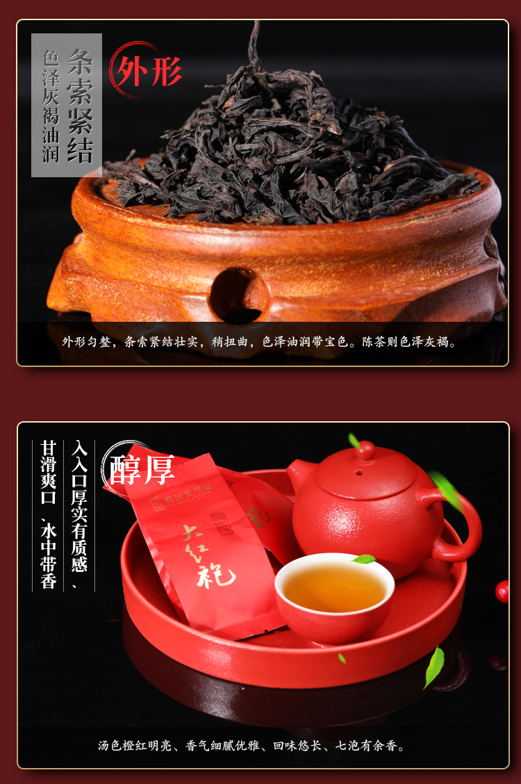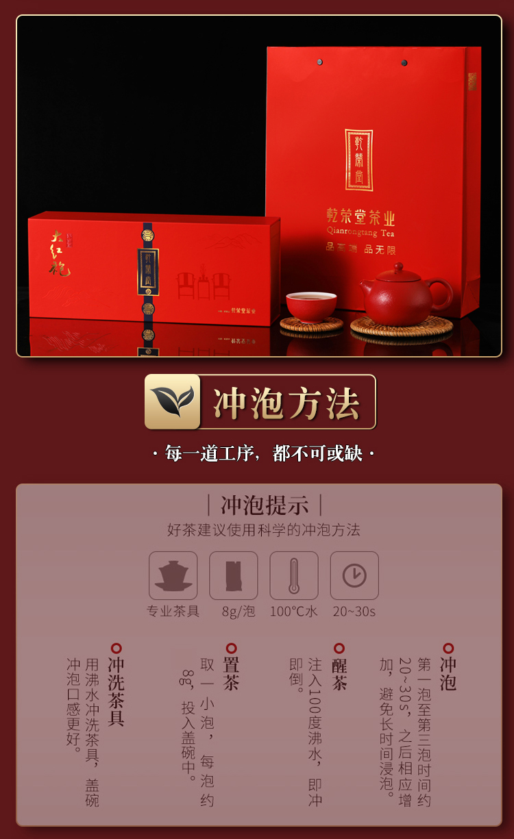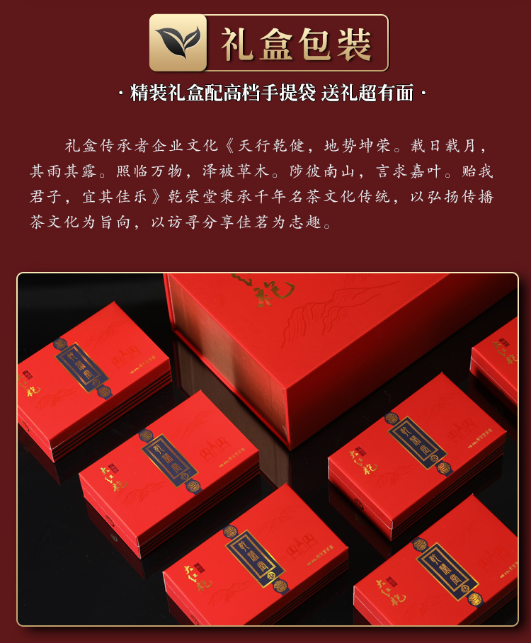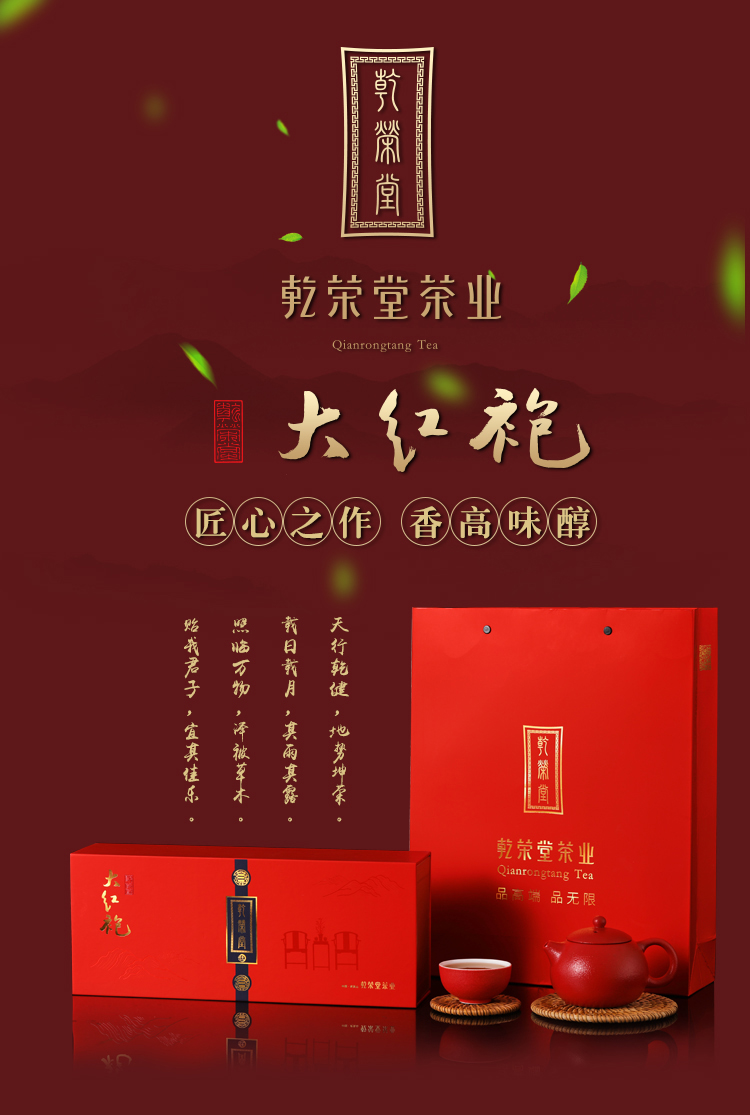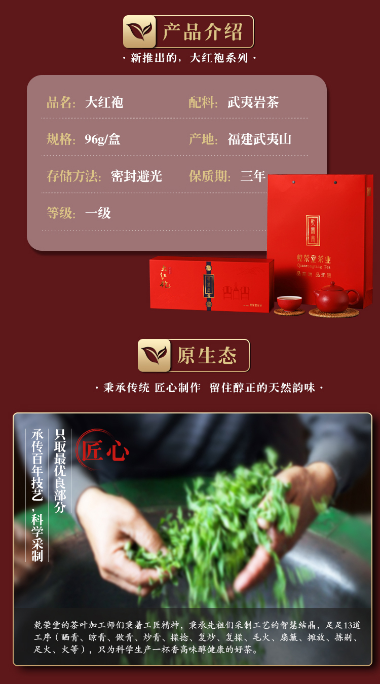 产品简介:乾荣御品,尊贵享受。大红袍是武夷岩茶中最有名的品类,产于世界文化与自然双重遗产地的武夷山,以其独特的岩骨花香之韵闻名全球。乾荣堂茶师们踏遍武夷山山山水水,层层把关、为您精挑细选的御品大红袍其外形条索紧结稍扭曲色灰褐油润、汤色橙红明亮、香清雅幽长、滋味醇厚,叶底软亮红边显。